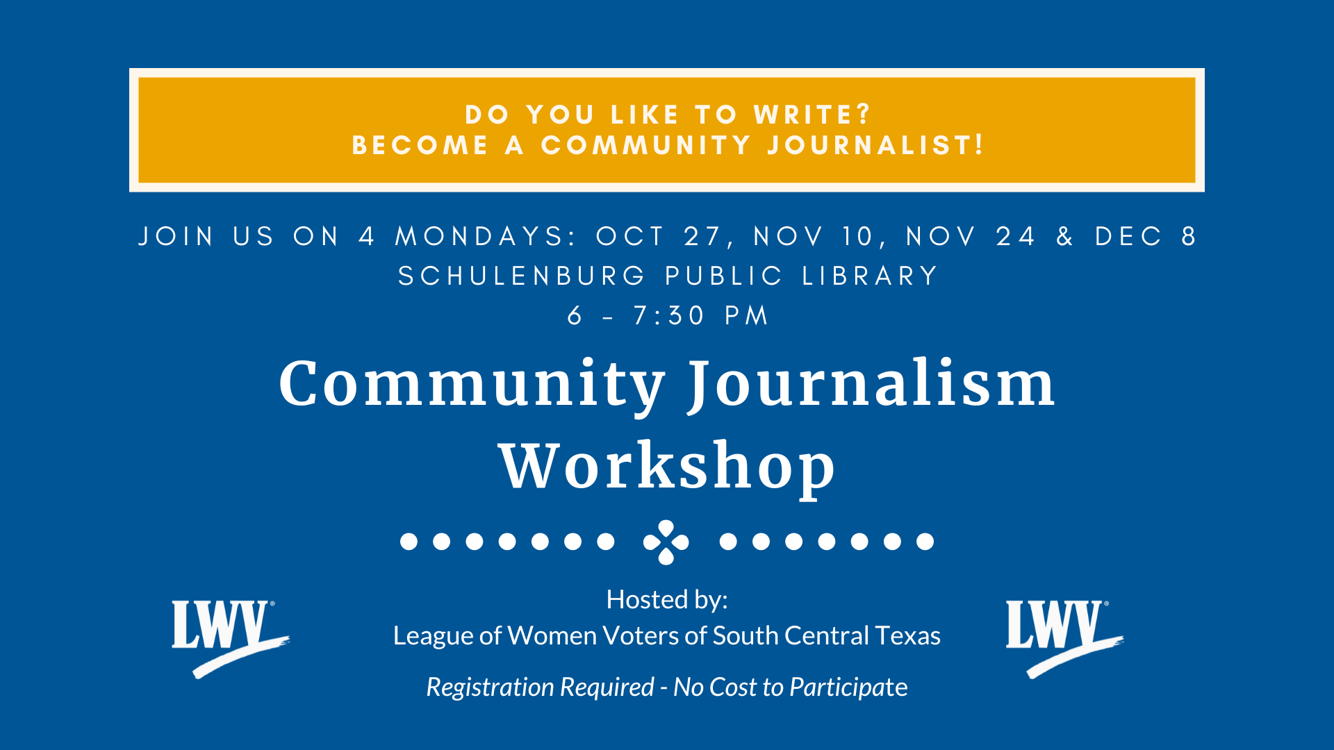 Join us for this engaging, hands-on workshop series designed to introduce you to community journalism and equip you with the skills to contribute meaningful articles and stories to local newspapers as a volunteer correspondent. While our region's newspapers already provide excellent foundational coverage, you can help enrich this work by bringing fresh perspectives, spotlighting hyperlocal events, and celebrating the unique voices that make our rural South Central Texas community so special.
